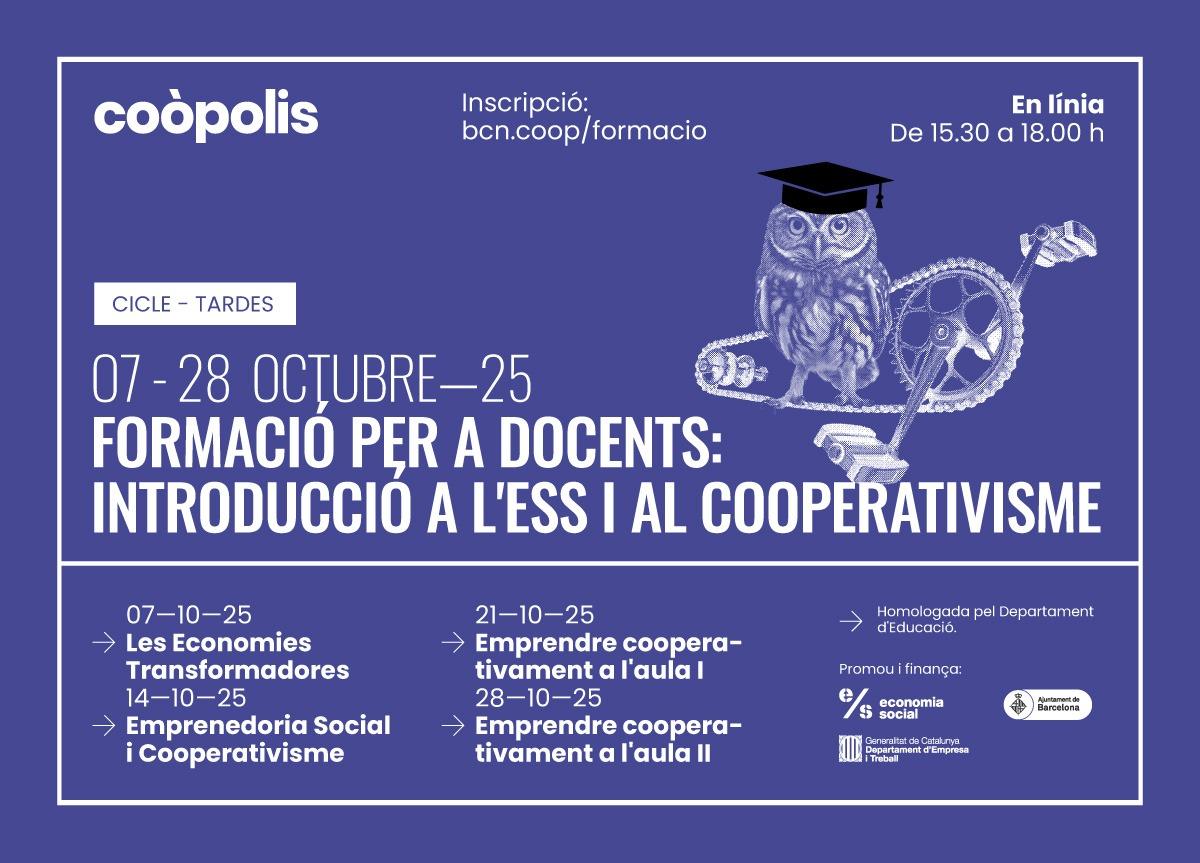 La formació ‘Introducció a l’ESS i al Cooperativisme’ està adreçada a docents, consta de 10 h en línia repartides en 4 sessions i està homologada pel Departament d’Educació.