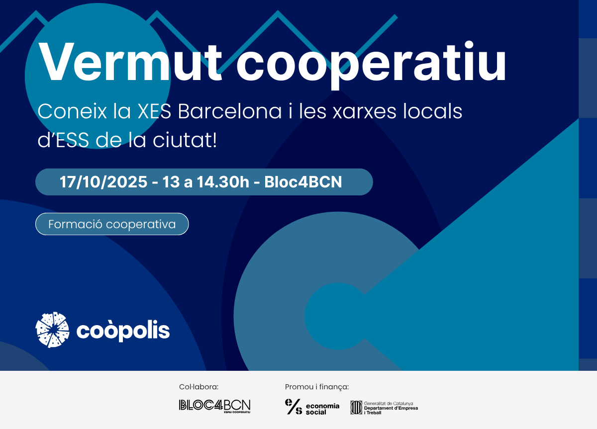 Després de les trobades amb l’Impuls Cooperatiu de Sants i la XES Sant Andreu, el pròxim divendres 3 d’octubre a les 13 h continuarem amb una presentació conjunta de les diferents Xarxes Locals d’ESS de la ciutat i de la XES Barcelona, l’espai on es coordinen i treballen plegades a escala de ciutat. Coneixerem els territoris que en formen part i ens compartiran la seva experiència i moment actual, els seus reptes, potencialitats, línies estratègiques i projectes compartits. I, per descomptat, compartirem un vermut (i pica-pica) cooperatiu!