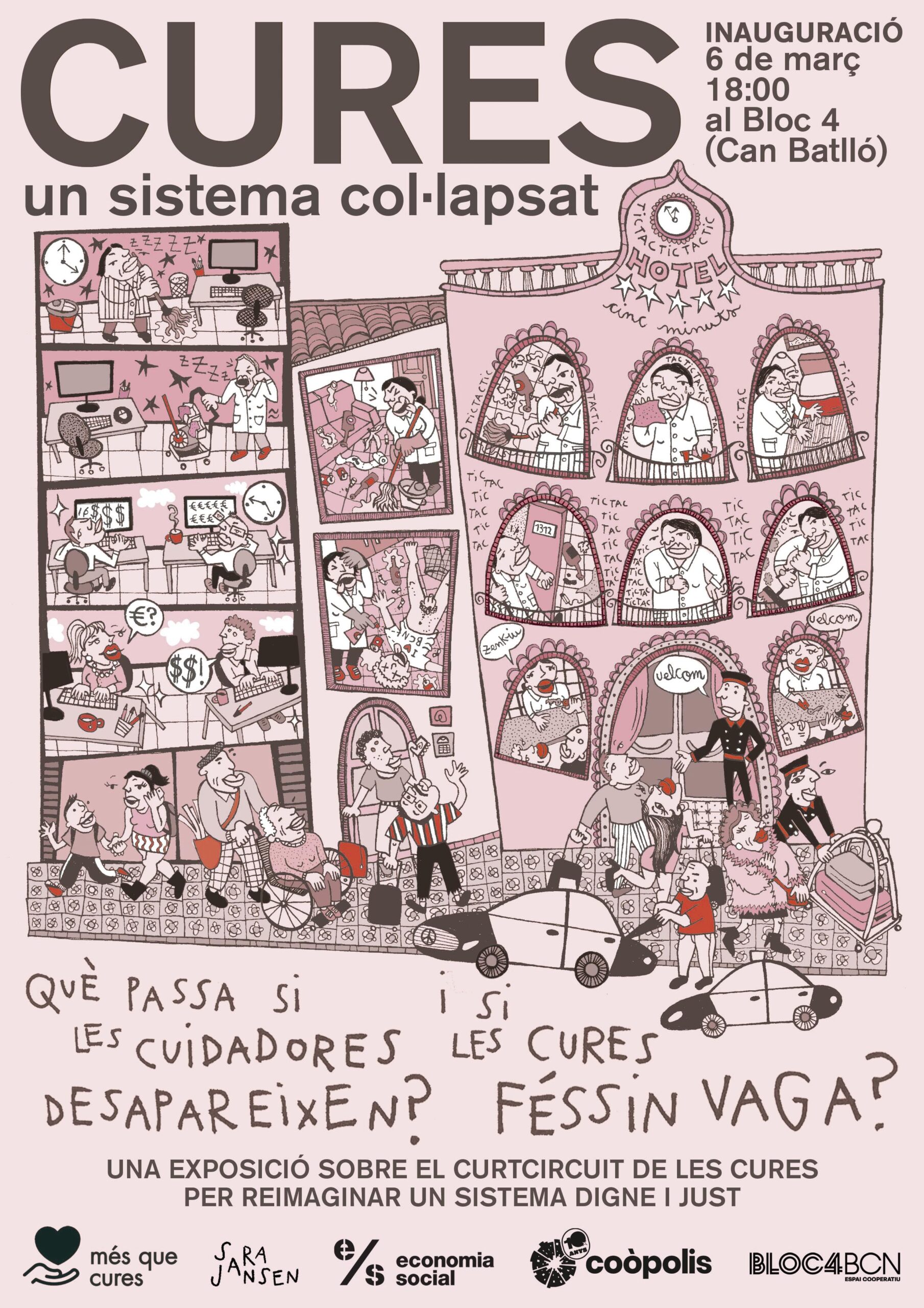 El passat divendres 6 de març al Bloc4BCN es va inaugurar l’exposició ‘Cures: un sistema col·lapsat’ impulsada pel Cercle d’Economies Feministes de Coòpolis i la il·lustradora Sara Jansen en col·laboració amb altres entitats del tercer sector i l’Economia Social i Solidària, com és el cas de Més que Cures. Una aposta creativa que, a través d’una narrativa visual de denúncia, política i distopia, posa l’accent en la dignificació de les cures com a tasca essencial per al funcionament de la societat. L’exposició es podrà visitar durant tot el mes de març.